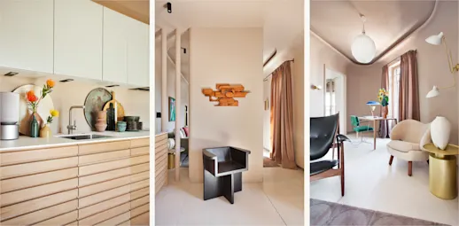 "Omringet av støvrosa vegger fra DETALE med støpte hjørner som skaper avrundede former, inviterer rommet deg inn og skaper en innbydende atmosfære."
