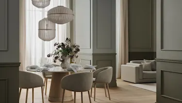 En afbalanceret kombination af rolige grønne nuancer og en raffineret grå, der fremhæver dagslyset og tilfører rummet jordnær ro. Velegnet til rum hvor stilhed og fordybelse er i fokus, fra læsehjørner til indbydende køkkener.