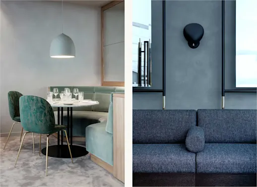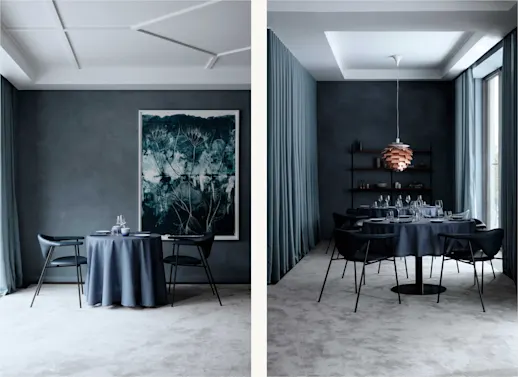 Til den lyse og behagelige stemning i Flora Danica brasserie, blev KC14 i farven Concrete brugt, til at tilføre lysegrå omgivelser med et fløjlslignende udtryk. I samarbejde med det danske designhus GUBI, udviklede de to designere bag GamFratesi helt nye designstykker, herunder TS Spisebordet. I perfekt overensstemmelse med navnet på restauranten - Flora Danica, pryder de traditionelle Flora Danica tegninger store vægområder. Derfor er den rene og minimalistiske farve Concrete, den perfekte måde at skabe en neutral kontrast til det klassisk inspirerede rum, mens der stadig tilføjes tekstur og liv til væggene.