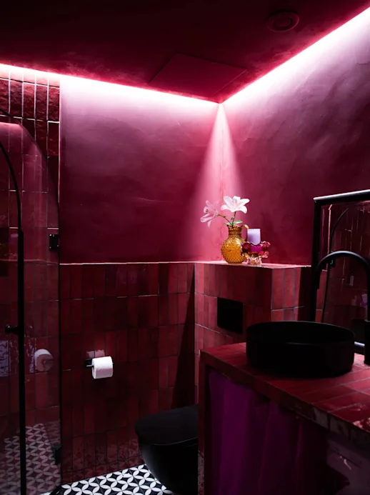 Når vi får gæster på besøg, er badeværelset altid noget, der bliver snakket om. Vi hører ofte et suk, når døren åbner, og de opdager den lille vinrøde hule inde bag døren. Farven er KC14 Burgundy og væggene er grovspartlet, for at få lige det look, vi ønskede. Med masser af tone-i-tone håndlavede fliser på badeværelset, som også er fra Marokko, giver det et let dæmpet og tilbagetrukket udtryk. Mange siger, at køkkenet er husets hjerte, i vores tilfælde er det badeværelset.