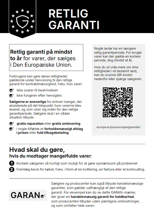 Som kunde kan du reklamere inden for 24 måneder efter fakturadato, men du skal rapportere manglen inden for rimelig tid, senest inden for 2 måneder. Reklamationen skal indeholde en beskrivelse og eventuelt billeder, der illustrerer problemet. Dette sikrer, at vi kan håndtere din henvendelse hurtigt og effektivt.