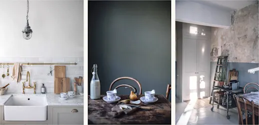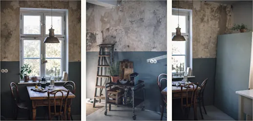 På väggen vid bordet kombineras den orörda originalväggen i byggnaden med den dimmiga blå färgen på KC14 Mist, vilket skapar kontrast i både färg och texturer. De bestämde sig för att täcka endast den nedre delen av väggen, så att den övre delen kunde behålla sitt ursprungliga utseende. För fotograferingar valde KC14 Dusty Jade, en bakgrund som är särskilt fotogen för matfoton. För alla sina fotoshoots behövde de ha en bakgrund. Detta skapades med hjälp av KC14 Dusty Jade, eftersom de tyckte att den här färgen var särskilt fotogen för matfoton.