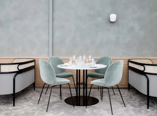 For the light and comfy vibe at the Flora Danica brasserie, KC14 in the colour Concrete was used, for light grey surroundings with a velvety look and feel to it. In collaboration with the Danish design house GUBI, the two designers behind GamFratesi developed brand new items, including the TS Dining Table. In perfect line with the name of the restaurant – Flora Danica, the traditional Flora Danica drawings decorate large wall areas. Therefore, the clean and minimalist shade of Concrete was the perfect way to create a neutral contrast to the classically inspired space, yet still adding texture and life to the walls.