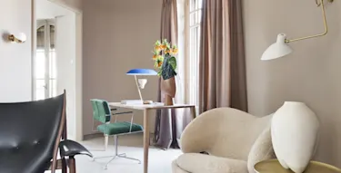 "Omringet av støvrosa vegger fra DETALE med støpte hjørner som skaper avrundede former, inviterer rommet deg inn og skaper en innbydende atmosfære."