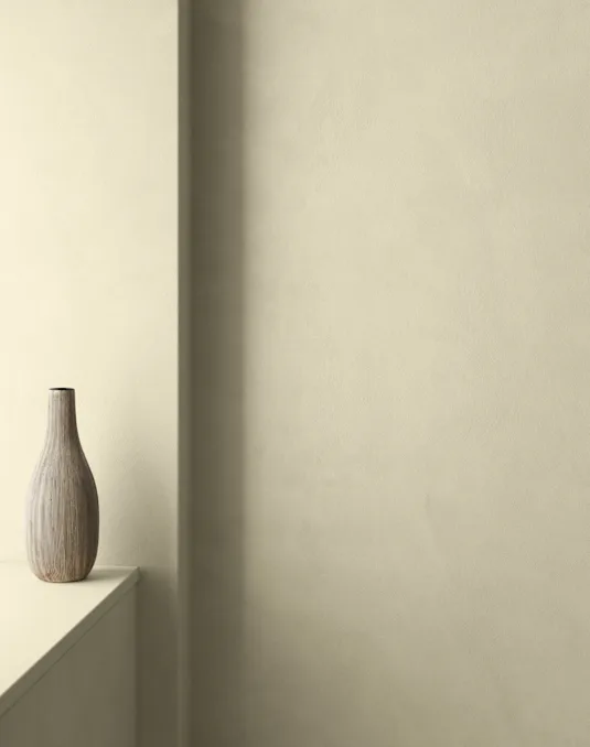 KABRIC är en texturfärg som kombinerar färgens funktionella egenskaper med spackels' visuella egenskaper i en matt, tygliknande yta.