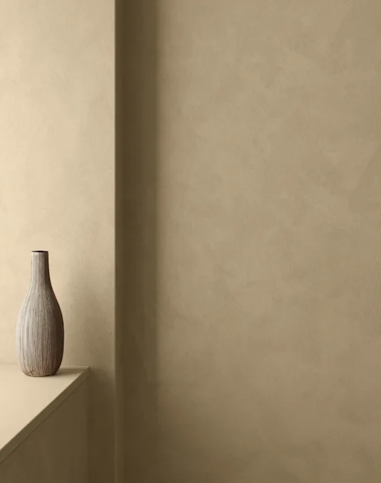 KABRIC är en texturfärg som kombinerar färgens funktionella egenskaper med spackels' visuella egenskaper i en matt, tygliknande yta.