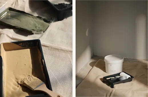 Fill any holes with filler and sand them smooth once dry. Wipe the wall with a damp cloth to remove dust. For larger areas, walls, ceilings or porous surfaces, consider applying a primer for an even result.