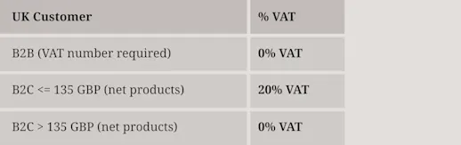 The B2C customer is responsible for paying VAT locally for all purchases above £135 once the product arrives in the UK.